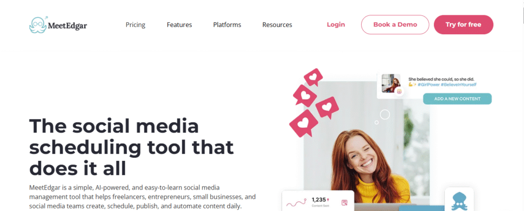 MeetEdgar | Evergreen content recycling | $29.99/month | Content recycling, category-based posting | 7 days |